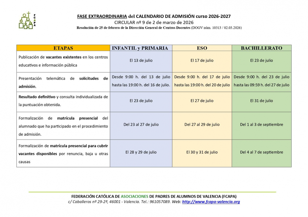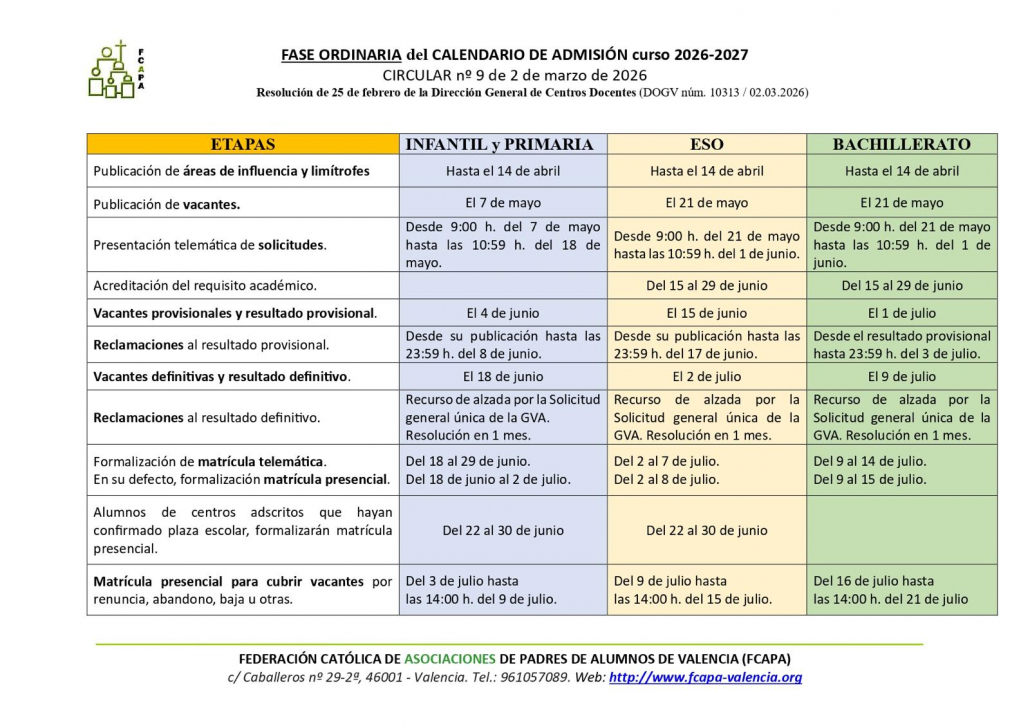 Os informamos de los calendarios de admisión que rigen para el curso 2026-2027 en los centros/enseñanzas de la Comunidad Valenciana sostenidos con fondos públicos que impartan: